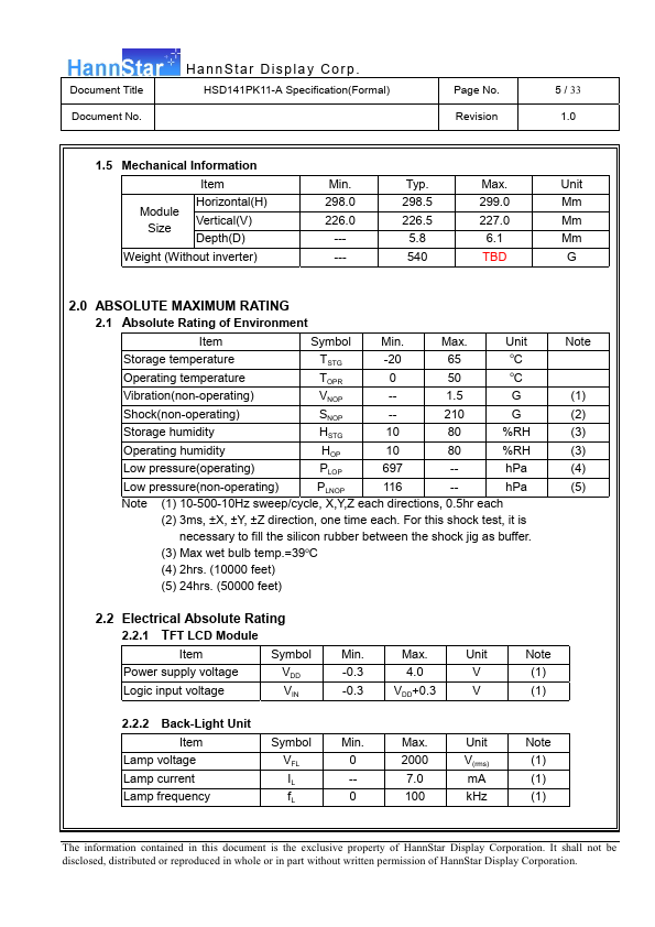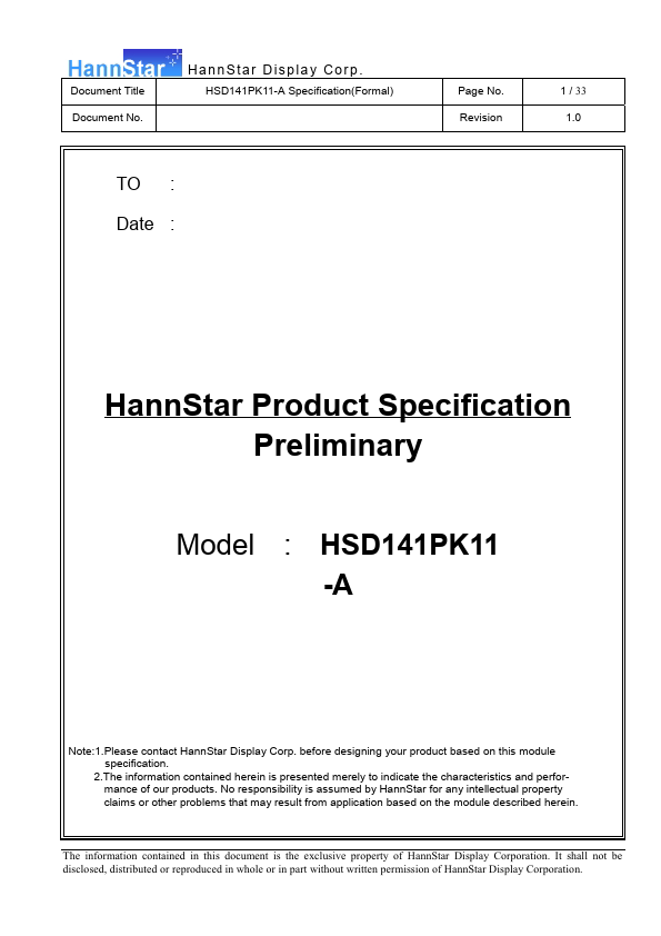 1.1 Introduction HannStar Display model HSD141PK11-A is a color active matrix thin film transistor (TFT) liquid crystal display(LCD) that uses amorphous silicon TFT as a switching device. This model is posed of a TFT LCD panel, a driving circuit and a back light system. This TFT LCD has a 14.1 inch diagonally measured active display area with SXGA+ resolution (1050 vertical by 1400 horizontal pixel array) and can...