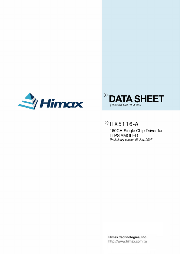 July, 2007 HX5116-A is a timing controller and driver LSI that integrated the power circuit. It can drive the 320RGBx240, 320RGBx480, 480RGBx272, 480RGBx234 and 240RGBx400 graphics on LTPS AMOLED panel displays in 16,777,216 colors.