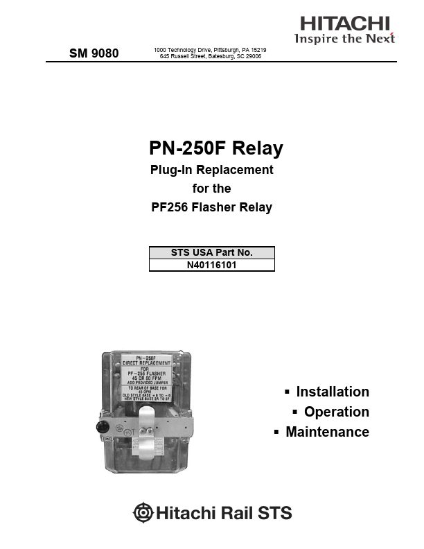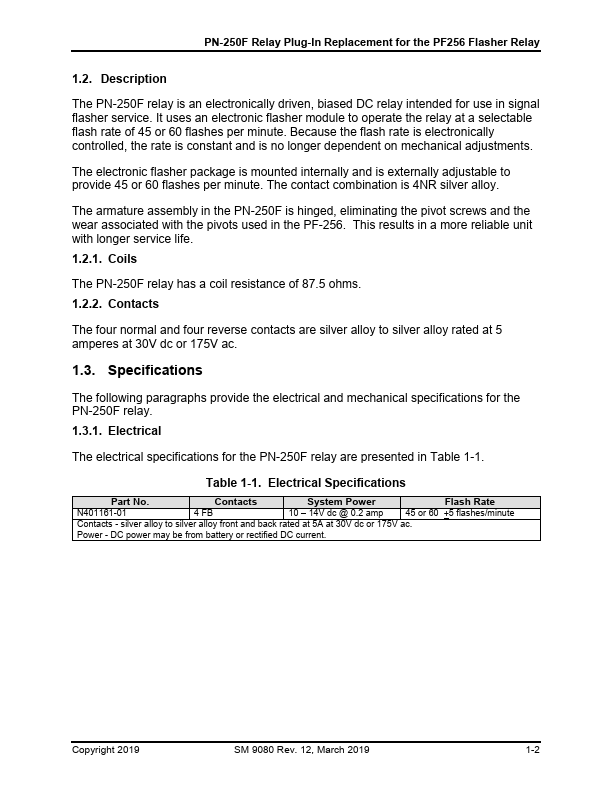 The PN-250F relay is an electronically driven, biased DC relay intended for use in signal flasher service. It uses an electronic flasher module to operate the relay at a selectable flash rate of 45 or 60 flashes per minute. Because the flash rate is electronically controlled, the rate is constant and is no longer dependent on mechanical adjustments.
