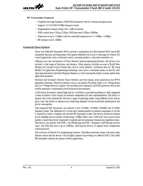 BC68F2130/BC68F2140/BC68F2150 Sub-1GHz RF Transmitter Flash MCU with OCDS