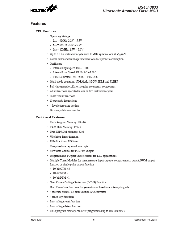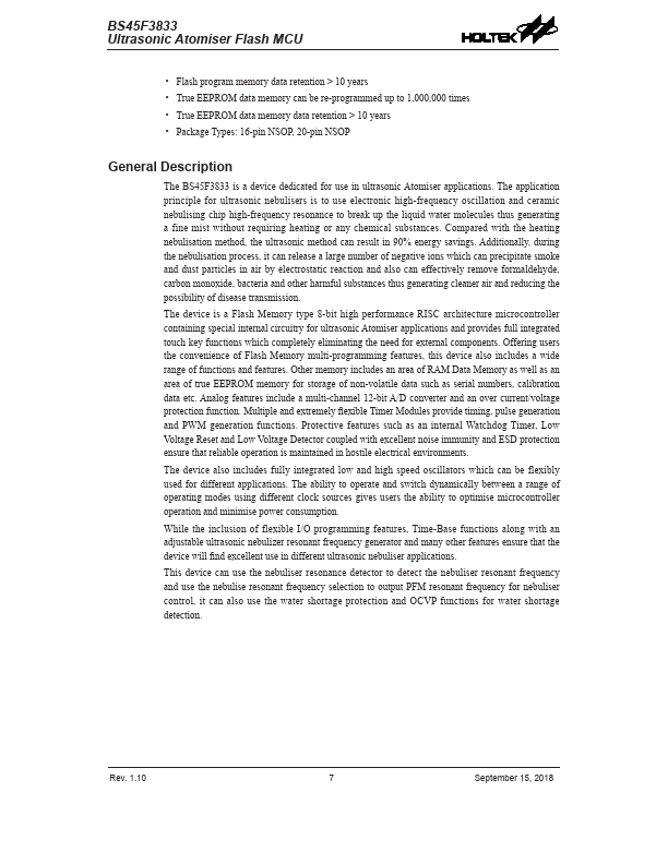 The BS45F3833 is a device dedicated for use in ultrasonic Atomiser applications. The application principle for ultrasonic nebulisers is to use electronic high-frequency oscillation and ceramic nebulising chip high-frequency resonance to break up the liquid water molecules thus generating a fine mist without requiring heating or any chemical substances. pared with the heating nebulisation method, the ultrasonic...