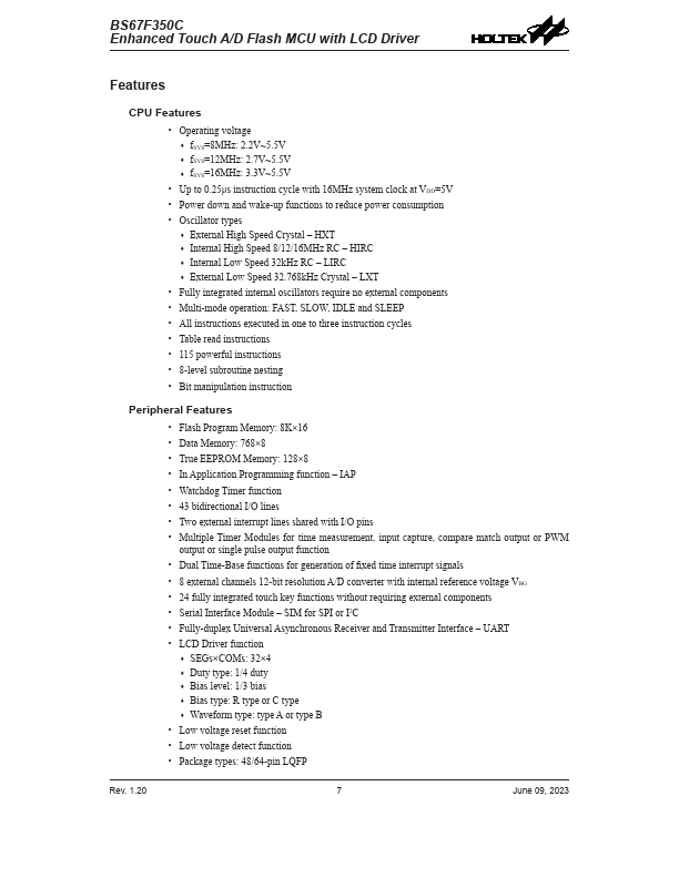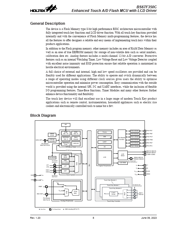 The device is a Flash Memory type 8-bit high performance RISC architecture microcontroller with fully integrated touch key functions and LCD driver function. With all touch key functions provided internally and with the convenience of Flash Memory multi-programming.