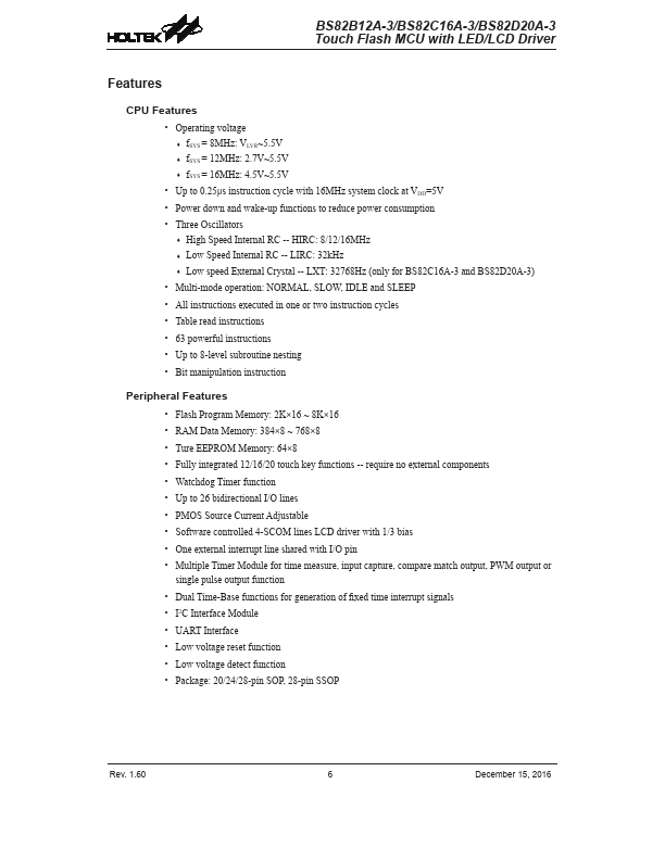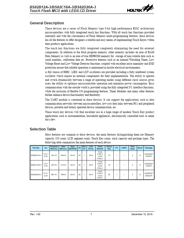 These devices are a series of Flash Memory type 8-bit high performance RISC architecture microcontrollers with fully integrated touch key functions. With all touch key functions provided internally and with the convenience of Flash Memory multi-programming.