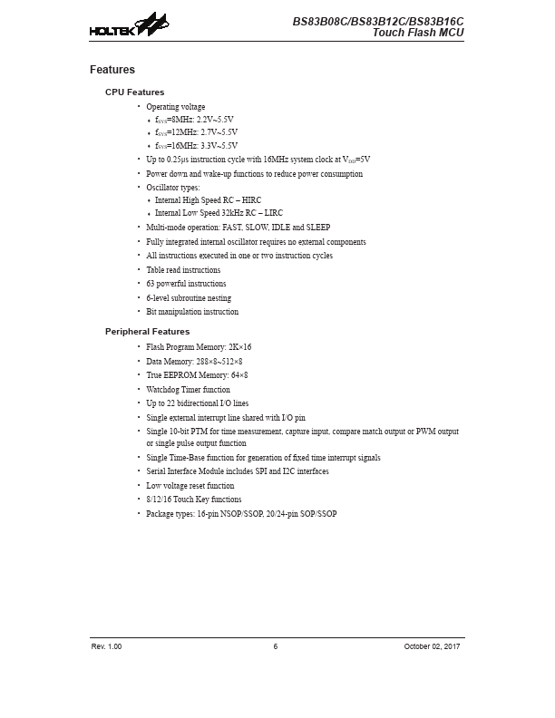 - Operating voltage -- fSYS=8MHz: 2.2V~5.5V -- fSYS=12MHz: 2.7V~5.5V -- fSYS=16MHz: 3.3V~5.5V