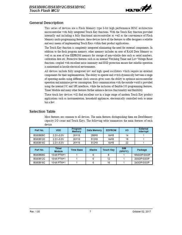 This series of devices are a Flash Memory type 8-bit high performance RISC architecture microcontroller with fully integrated Touch Key functions. With the Touch Key function provided internally and including a fully functional microcontroller as well as the convenience of Flash Memory multi-programming.