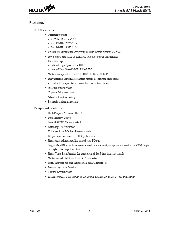 - Operating voltage -- fSYS=8MHz: 2.2V~5.5V -- fSYS=12MHz: 2.7V~5.5V -- fSYS=16MHz: 3.3V~5.5V