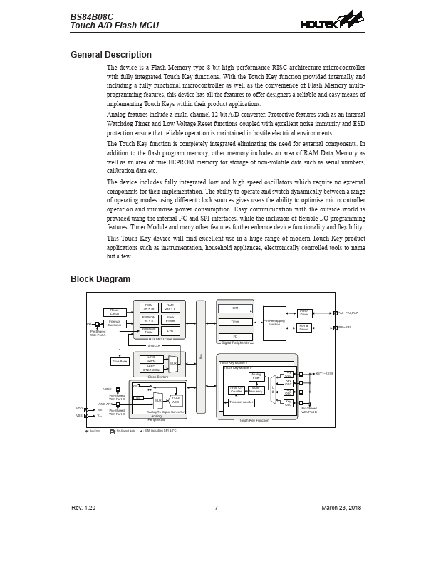 The device is a Flash Memory type 8-bit high performance RISC architecture microcontroller with fully integrated Touch Key functions. With the Touch Key function provided internally and including a fully functional microcontroller as well as the convenience of Flash Memory multiprogramming.