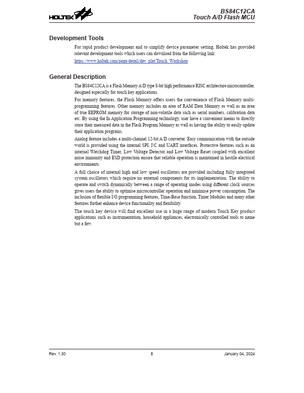 The BS84C12CA is a Flash Memory A/D type 8-bit high performance RISC architecture microcontroller, designed especially for touch key applications.