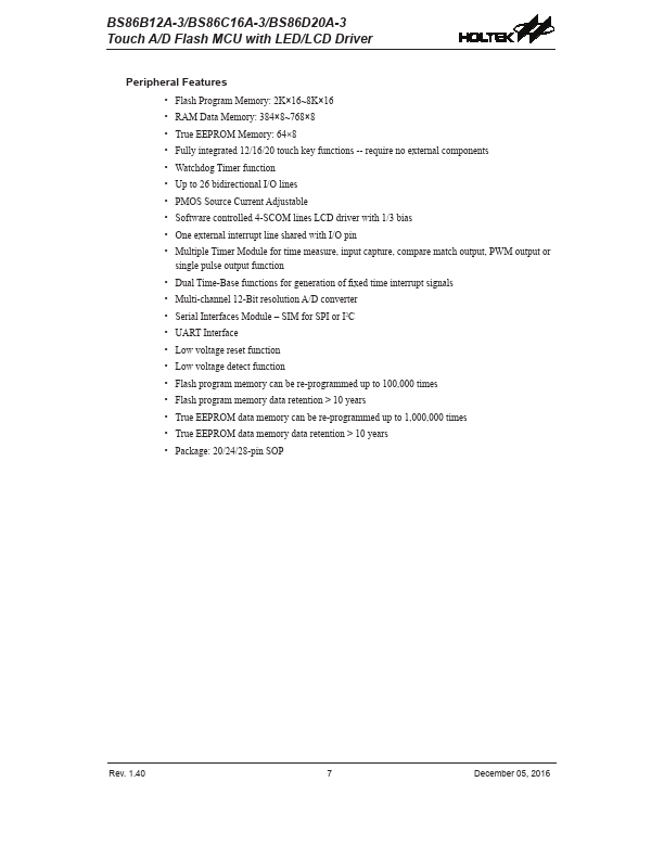 These devices are a series of Flash Memory type 8-bit high performance RISC architecture microcontrollers with fully integrated touch key functions. With all touch key functions provided internally and with the convenience of Flash Memory multi-programming.