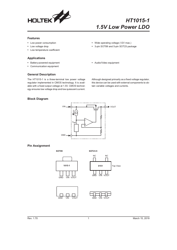 The HT1015-1 is a three-terminal low power voltage regulator implemented in CMOS technology. It is available with a fixed output voltage at 1.5V. CMOS technology ensures low voltage drop and low quiescent current.