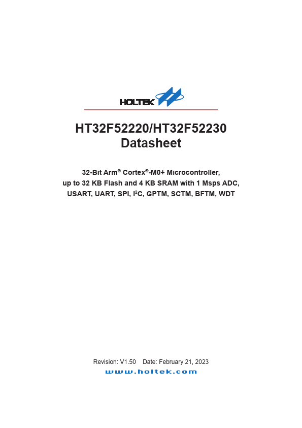 The Holtek HT32F52220/52230 devices are high performance, low power consumption 32-bit microcontrollers based around an Arm® Cortex®-M0+ processor core. The Cortex®-M0+ is a nextgeneration processor core which is tightly coupled with Nested Vectored Interrupt Controller (NVIC), SysTick timer, and including advanced debug support. The devices operate at a frequency of up to 40 MHz for HT32F52220/52230 with a Flash...