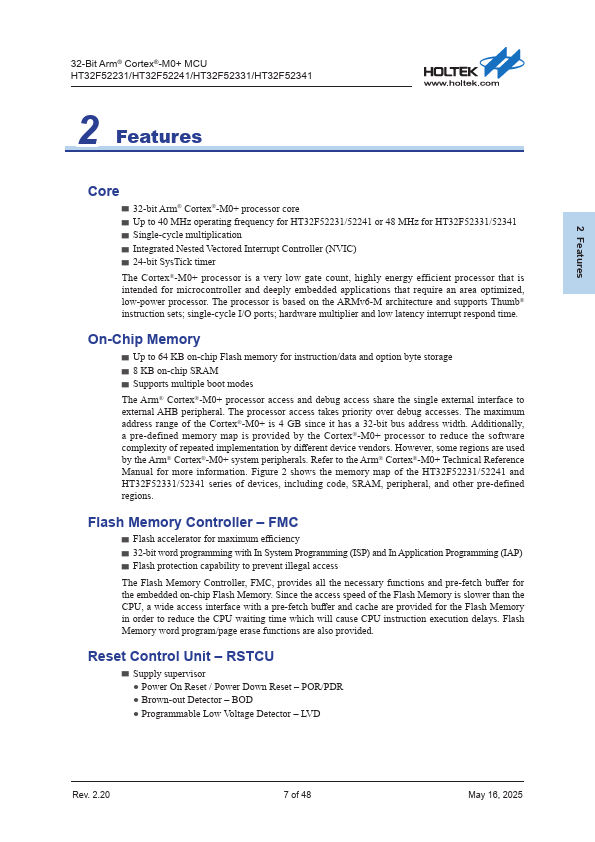 The Holtek HT32F522x1/523x1 devices are high performance, low power consumption 32-bit microcontrollers based around an Arm® Cortex®-M0+ processor core. The Cortex®-M0+ is a next-generation processor core which is tightly coupled with Nested Vectored Interrupt Controller (NVIC), SysTick timer, and including advanced debug support. The devices operate at a frequency of up to 40 MHz for HT32F52231/52241 and 48 MHz for...