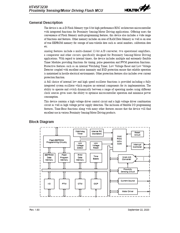 The device is an A/D Flash Memory type 8-bit high performance RISC architecture microcontroller with integrated functions for Proximity Sensing/Motor Driving applications. Offering users the convenience of Flash Memory multi-programming.