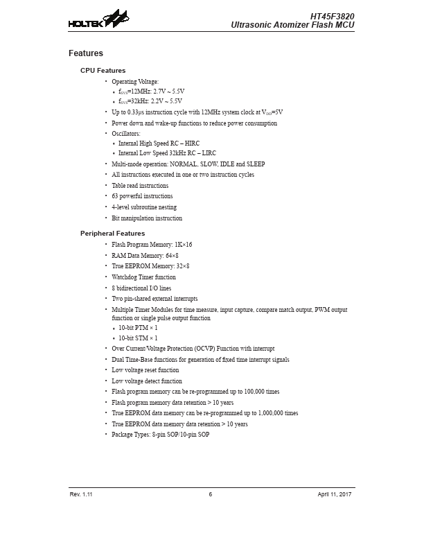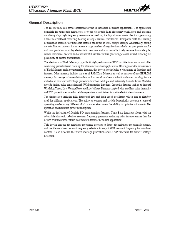 The HT45F3820 is a device dedicated for use in ultrasonic nebuliser applications. The application principle for ultrasonic nebulisers is to use electronic high-frequency oscillation and ceramic nebulising chip high-frequency resonance to break up the liquid water molecules thus generating a fine mist without requiring heating or any chemical substances. pared with the heating nebulisation method, the ultrasonic...