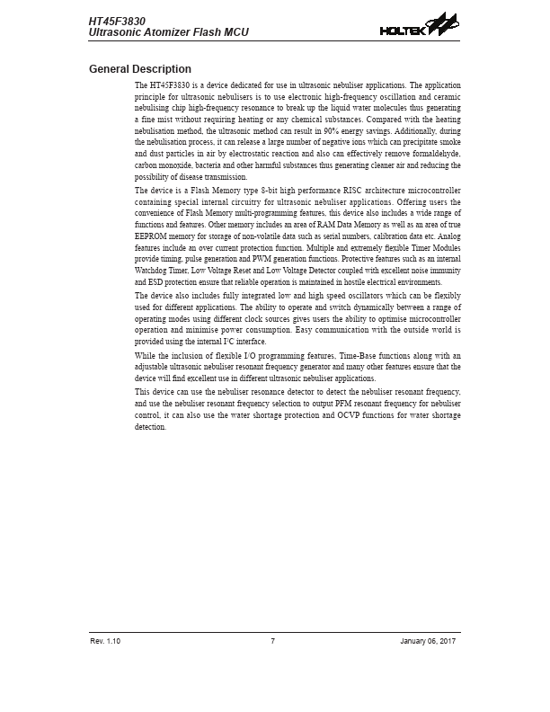 The HT45F3830 is a device dedicated for use in ultrasonic nebuliser applications. The application principle for ultrasonic nebulisers is to use electronic high-frequency oscillation and ceramic nebulising chip high-frequency resonance to break up the liquid water molecules thus generating a fine mist without requiring heating or any chemical substances. pared with the heating nebulisation method, the ultrasonic...