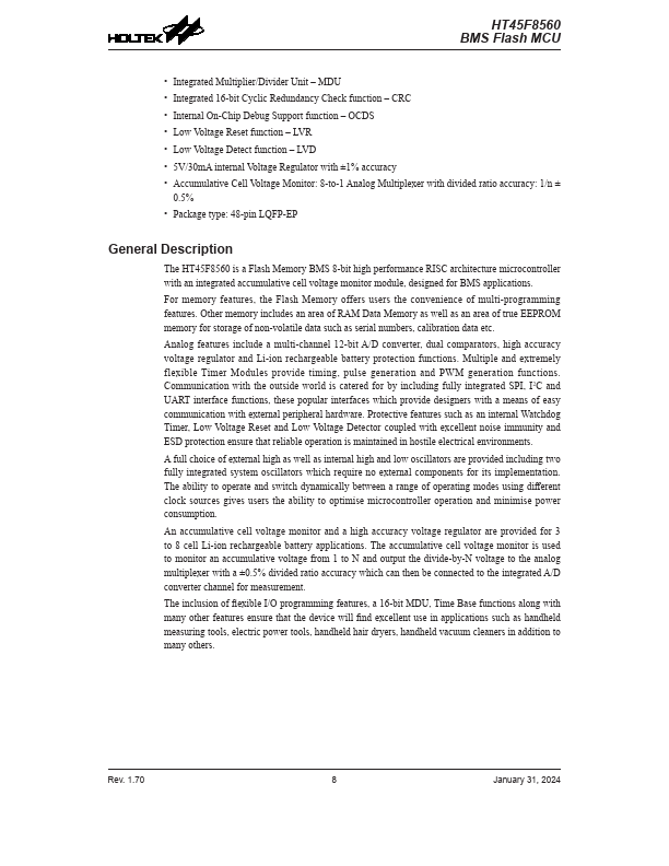 The HT45F8560 is a Flash Memory BMS 8-bit high performance RISC architecture microcontroller with an integrated accumulative cell voltage monitor module, designed for BMS applications.