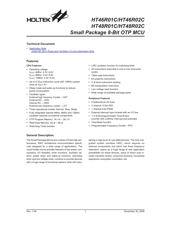 The Small Package MCUs are a series of 8-bit high performance, RISC architecture microcontrollers specifically designed for a wide range of applications. The usual Holtek microcontroller.