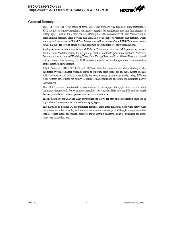 The HT67F488/HT67F489 series of devices are Flash Memory A/D type 8-bit high performance RISC architecture microcontrollers, designed especially for applications that interface directly to analog signals, such as those from sensors. Offering users the convenience of Flash Memory multiprogramming.