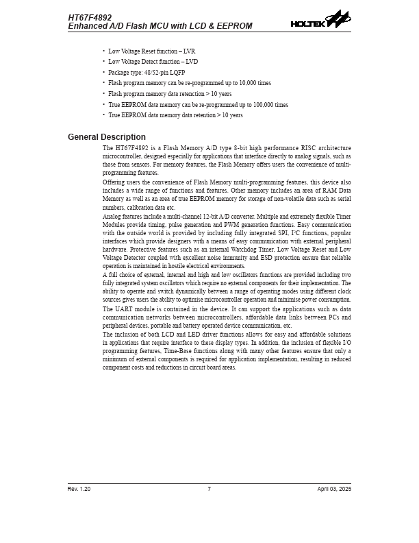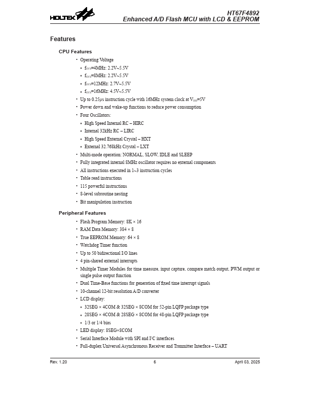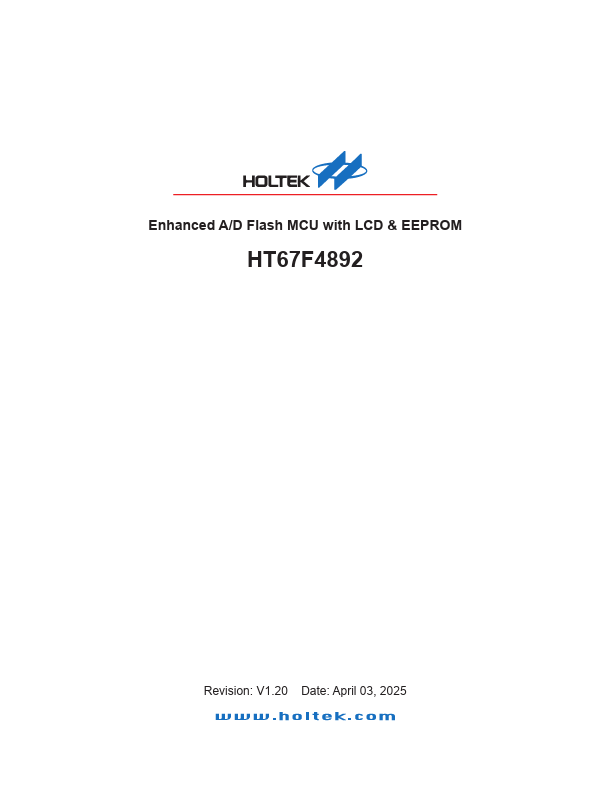 The HT67F4892 is a Flash Memory A/D type 8-bit high performance RISC architecture microcontroller, designed especially for applications that interface directly to analog signals, such as those from sensors.
