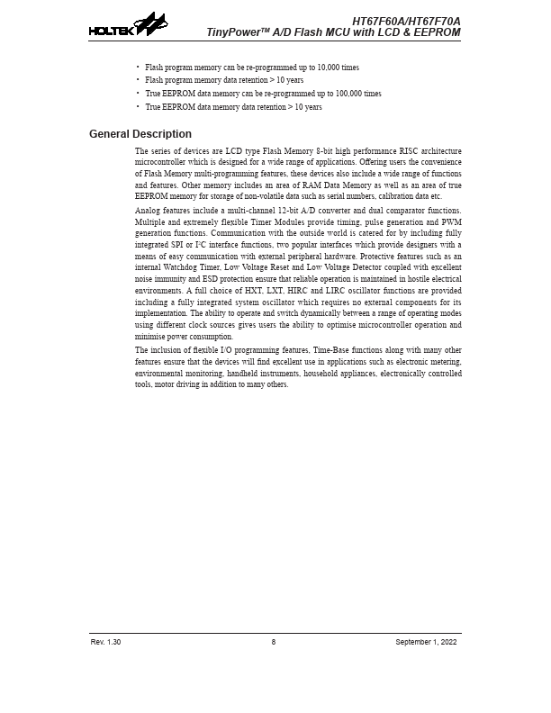 The series of devices are LCD type Flash Memory 8-bit high performance RISC architecture microcontroller which is designed for a wide range of applications. Offering users the convenience of Flash Memory multi-programming.