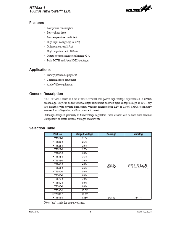 The HT75xx-1 series is a set of three-terminal low power high voltage implemented in CMOS technology. They can deliver 100mA output current and allow an input voltage as high as 30V. They are available with several fixed output voltages ranging from 2.1V to 12.0V.
