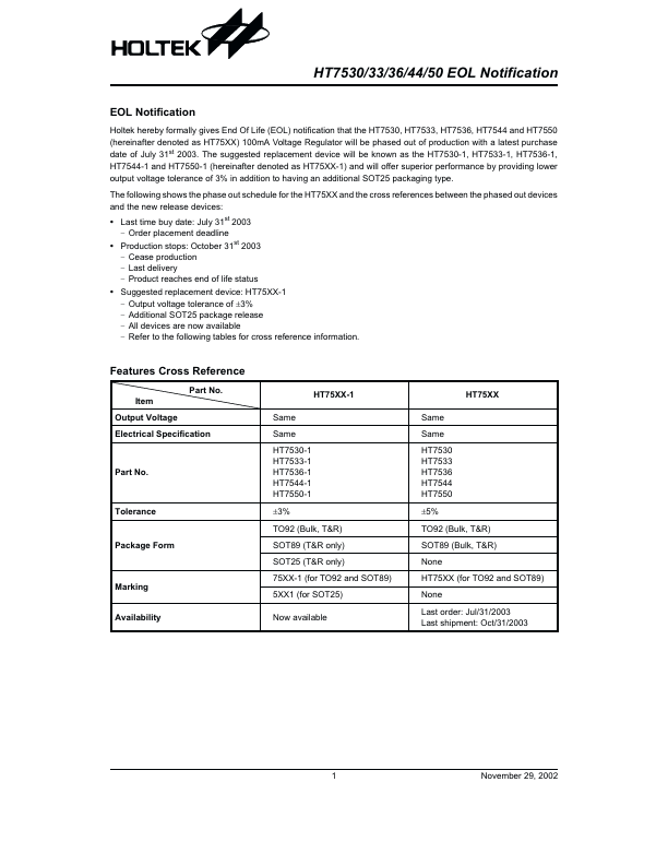 The following shows the phase out schedule for the HT75XX and the cross references between the phased out devices and the new release devices: July 31st 2003 - Order placement deadline · Production stops: October 31st 2003 - Cease production - Last delivery - Product reaches end of life status · Suggested replacement device:.
