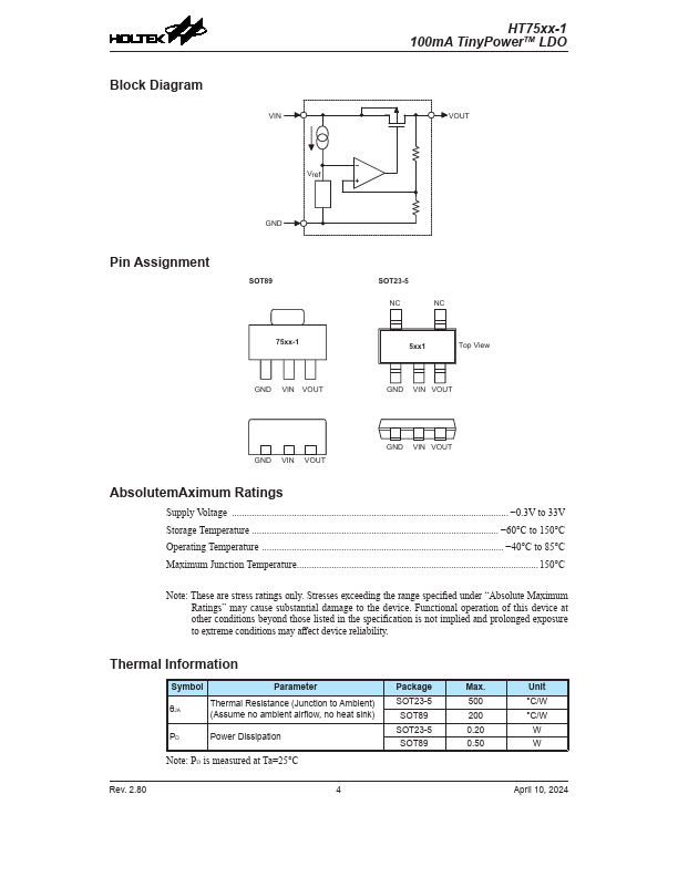 The HT75xx-1 series is a set of three-terminal low power high voltage implemented in CMOS technology. They can deliver 100mA output current and allow an input voltage as high as 30V. They are available with several fixed output voltages ranging from 2.1V to 12.0V.