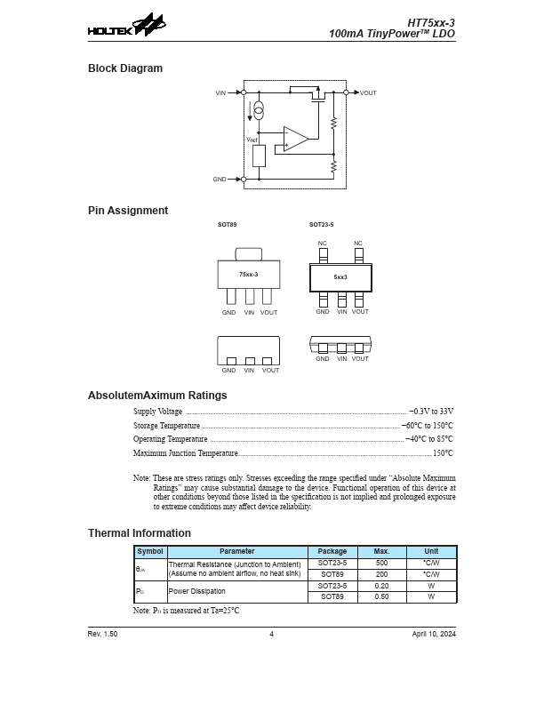 The HT75xx-3 series is a set of three-terminal low power high voltage implemented in CMOS technology. They can deliver 100mA output current and allow an input voltage as high as 30V. They are available with several fixed output voltages ranging from 2.1V to 12.0V.