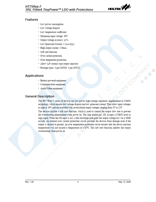 The HT75Rxx-7 series of devices are low-power high-voltage regulators implemented in CMOS technology, which ensures low voltage dropout and low quiescent current. They allow input voltages as high as 30V and are available with several fixed output voltages ranging from 3V to 12V. The devices include a soft start function, which is used to control the output slew rate to prevent the overshooting phenomenon when power...