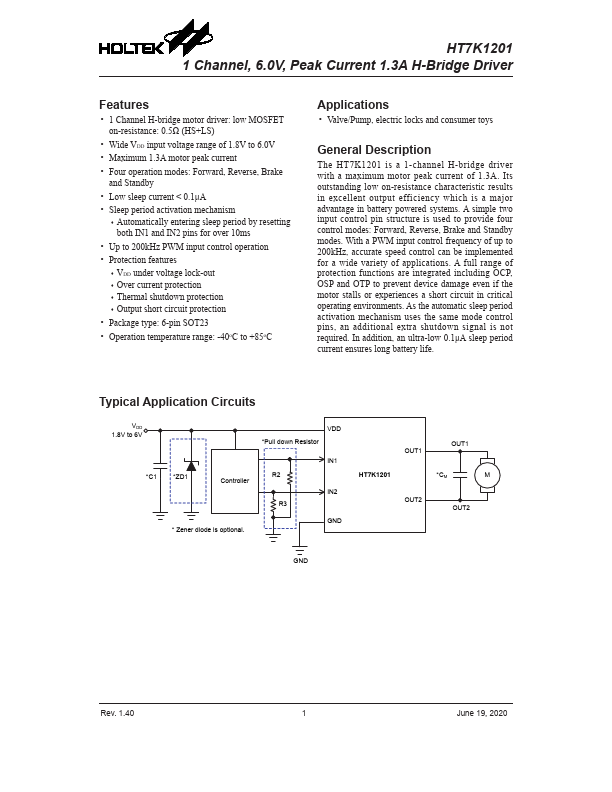 The HT7K1201 is a 1-channel H-bridge driver with a maximum motor peak current of 1.3A. Its outstanding low on-resistance characteristic results in excellent output efficiency which is a major advantage in battery powered systems. A simple two input control pin structure is used to provide four control modes:.