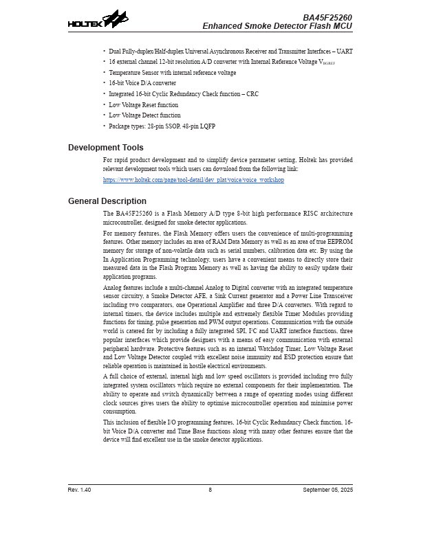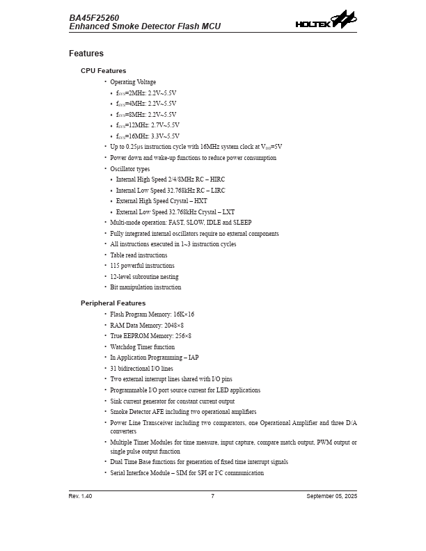 The BA45F25260 is a Flash Memory A/D type 8-bit high performance RISC architecture microcontroller, designed for smoke detector applications.