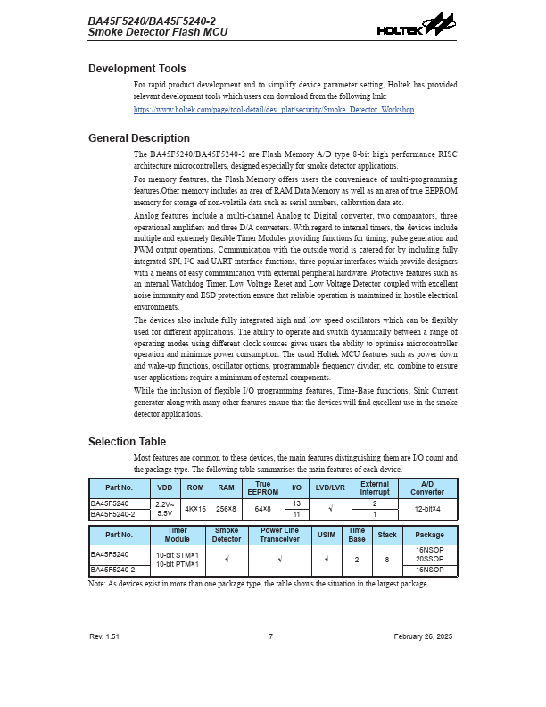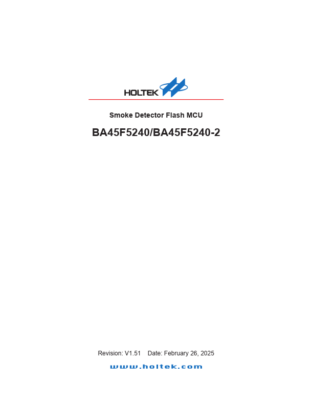 The BA45F5240/BA45F5240-2 are Flash Memory A/D type 8-bit high performance RISC architecture microcontrollers, designed especially for smoke detector applications.
