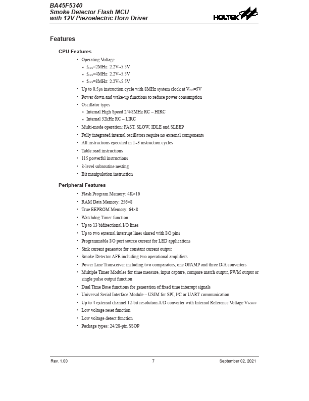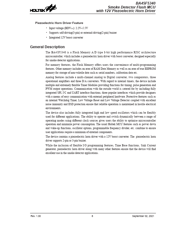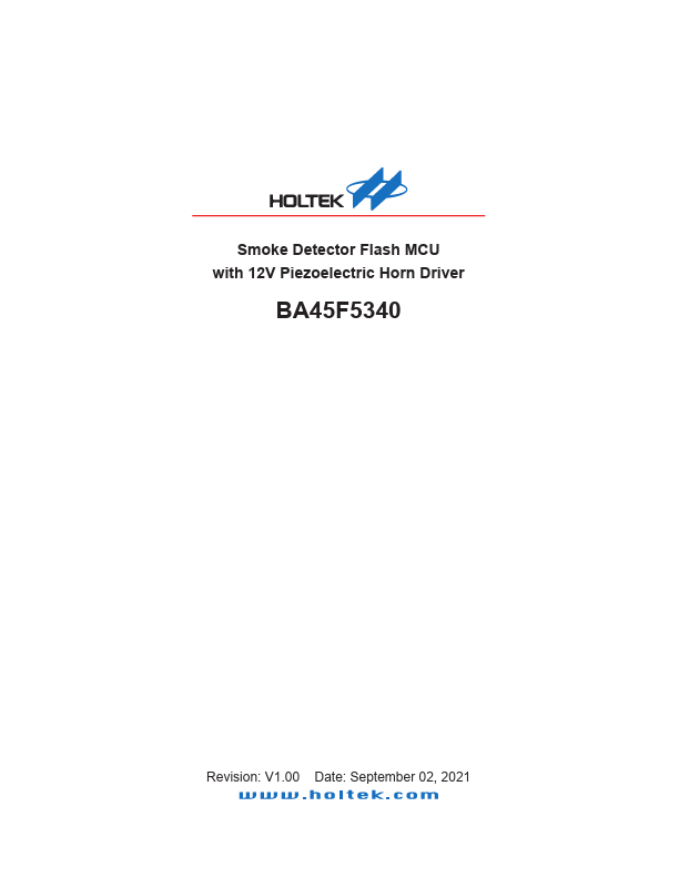 The BA45F5340 is a Flash Memory A/D type 8-bit high performance RISC architecture microcontroller, which includes a piezoelectric horn driver with boost converter, designed especially for smoke detector applications.