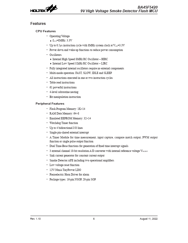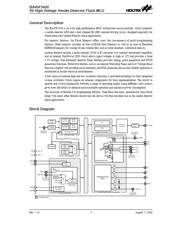 The BA45F5420 is an 8-bit high performance RISC architecture microcontroller, which integrates a smoke detector AFE and a dual channel IR LED constant driving circuit, designed especially for Stand-alone type Smoke Detector alarm applications.