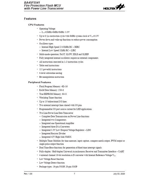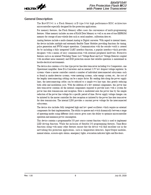 The BA45F5541 is a Flash Memory A/D type 8-bit high performance RISC architecture microcontroller especially designed for fire protection applications.