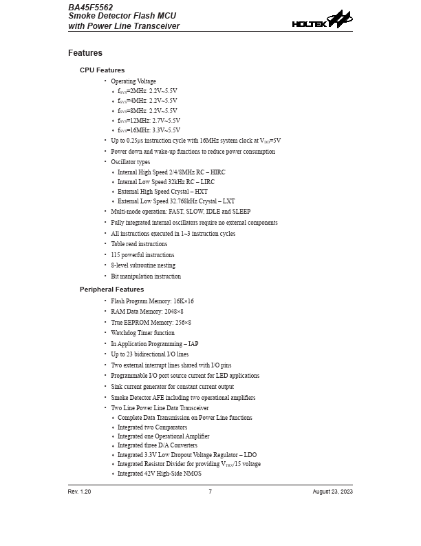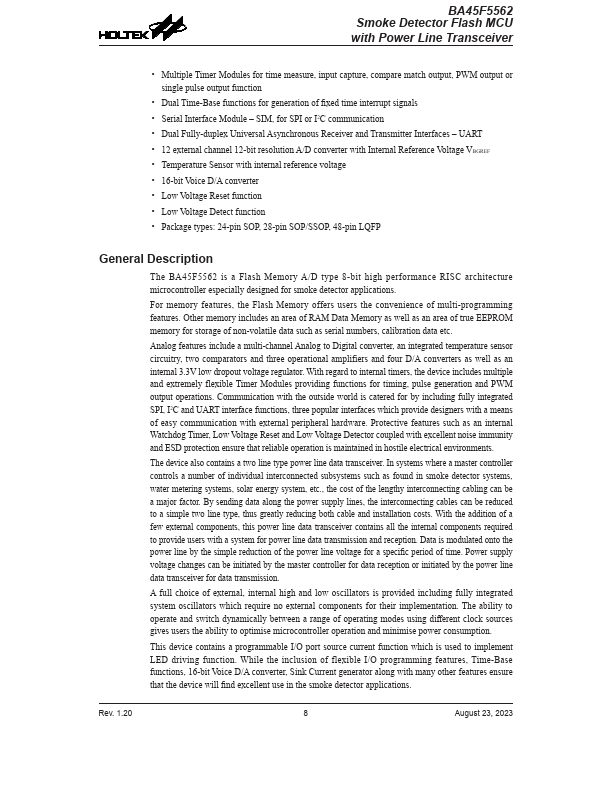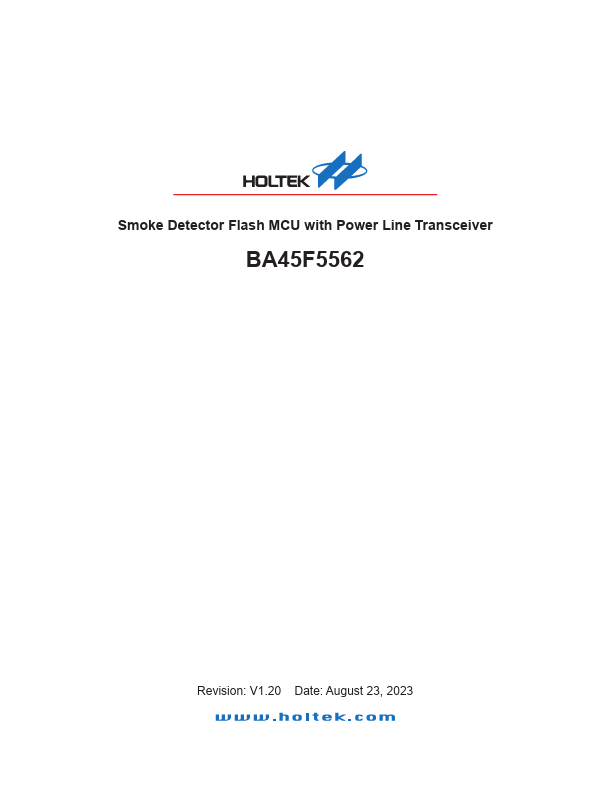 The BA45F5562 is a Flash Memory A/D type 8-bit high performance RISC architecture microcontroller especially designed for smoke detector applications.