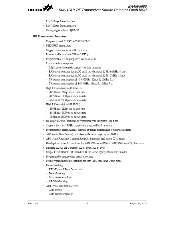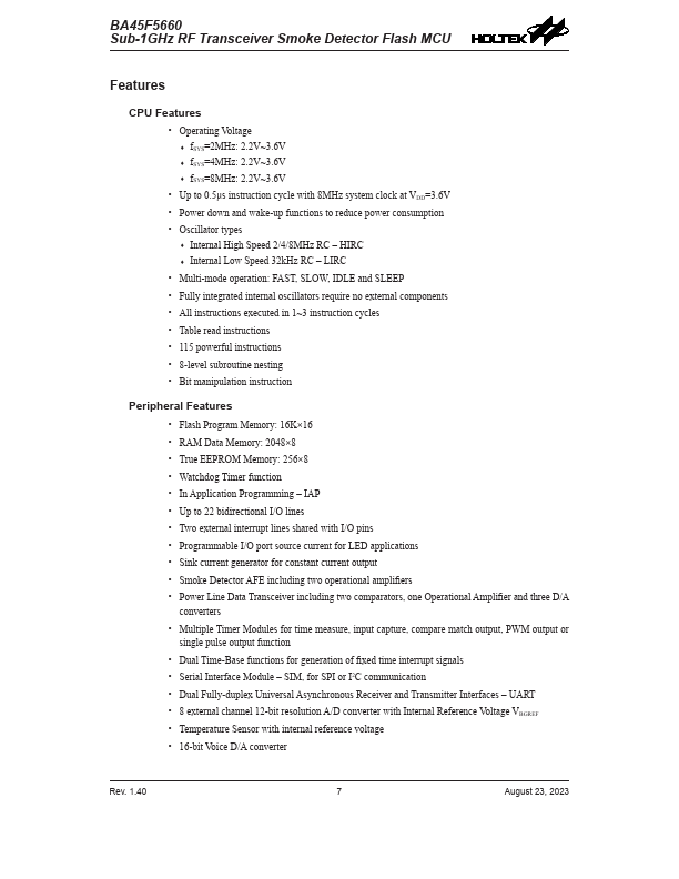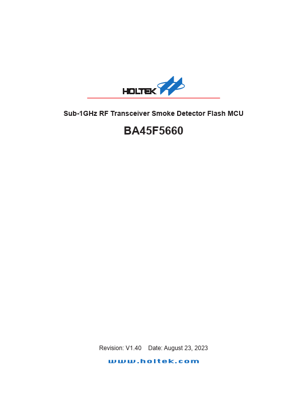 Sub-1GHz RF Transceiver Smoke Detector Flash MCU BA45F5660 Revision: August 23, 2023 BA45F5660 Sub-1GHz RF Transceiver Smoke Detector Flash MCU.