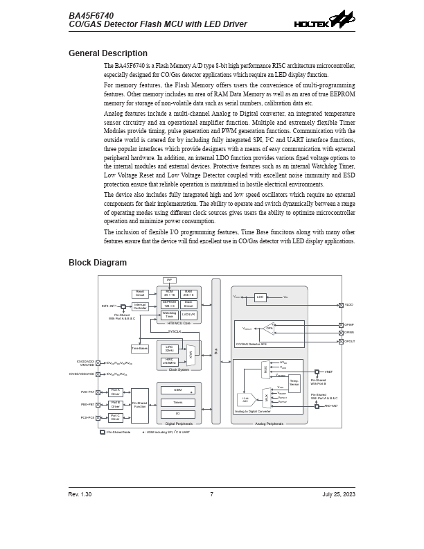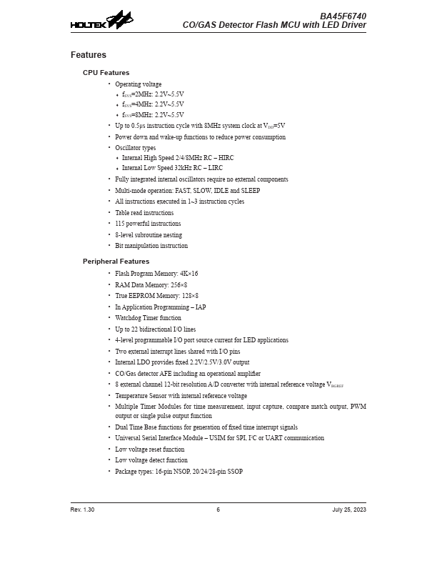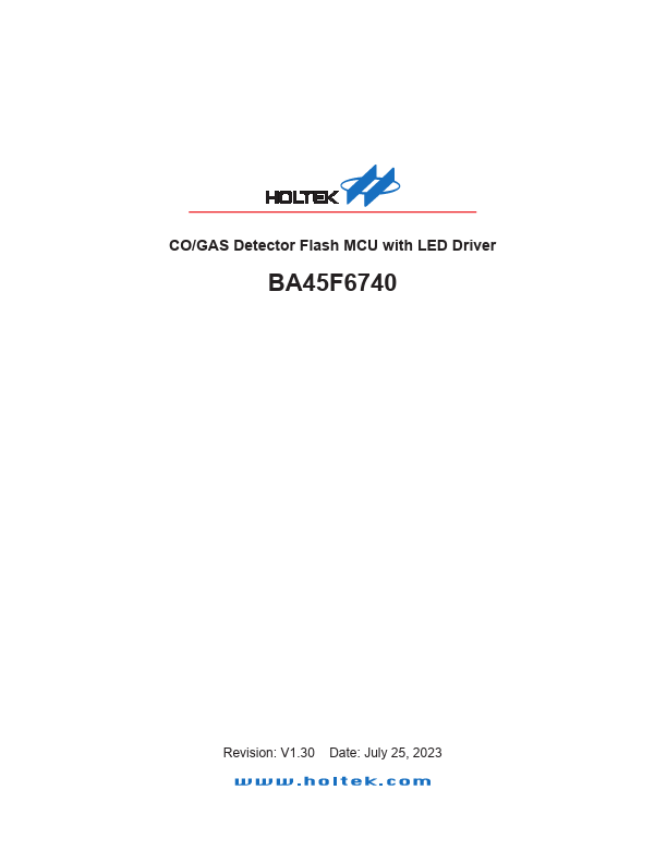 The BA45F6740 is a Flash Memory A/D type 8-bit high performance RISC architecture microcontroller, especially designed for CO/Gas detector applications which require an LED display function.