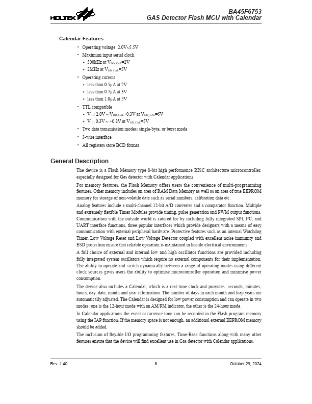 The device is a Flash Memory type 8-bit high performance RISC architecture microcontroller, especially designed for Gas detector with Calendar applications.