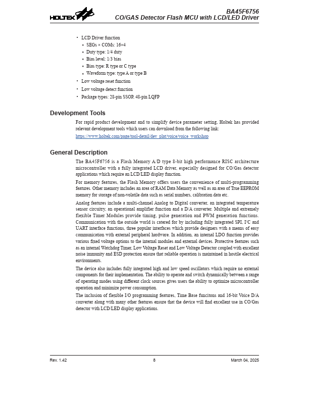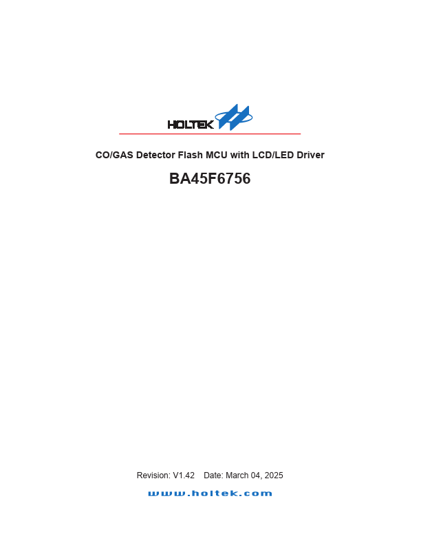 The BA45F6756 is a Flash Memory A/D type 8-bit high performance RISC architecture microcontroller with a fully integrated LCD driver, especially designed for CO/Gas detector applications which require an LCD/LED display function.