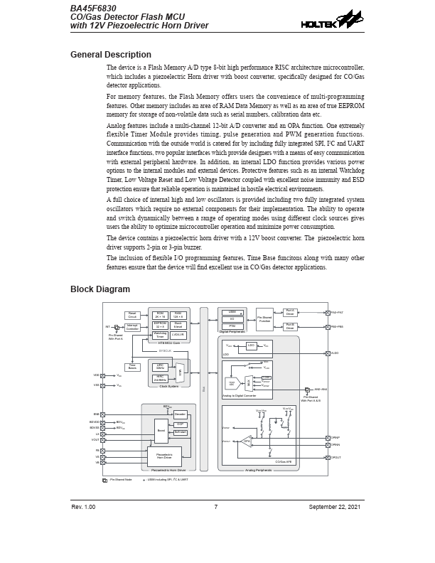 The device is a Flash Memory A/D type 8-bit high performance RISC architecture microcontroller, which includes a piezoelectric Horn driver with boost converter, specifically designed for CO/Gas detector applications.