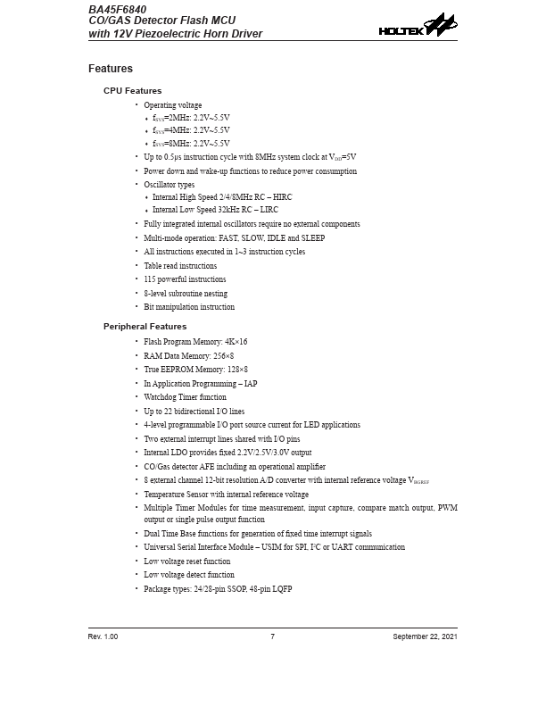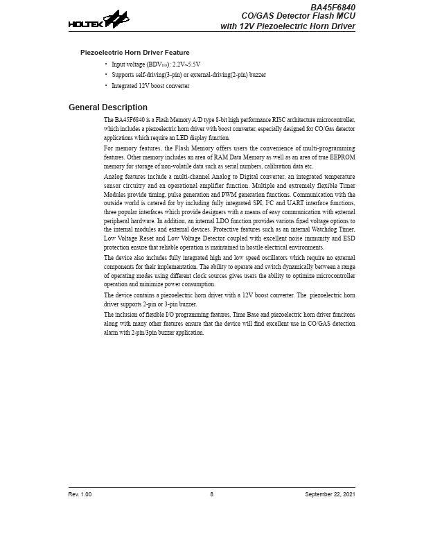 The BA45F6840 is a Flash Memory A/D type 8-bit high performance RISC architecture microcontroller, which includes a piezoelectric horn driver with boost converter, especially designed for CO/Gas detector applications which require an LED display function.
