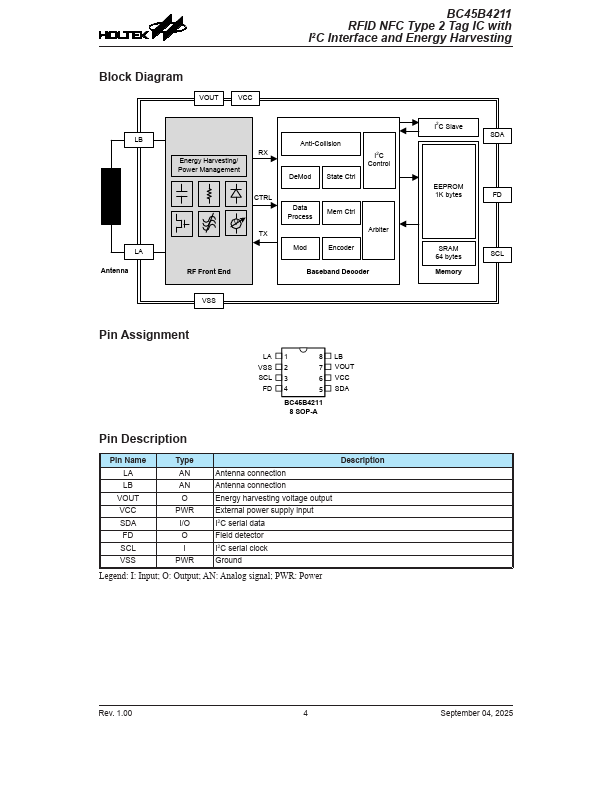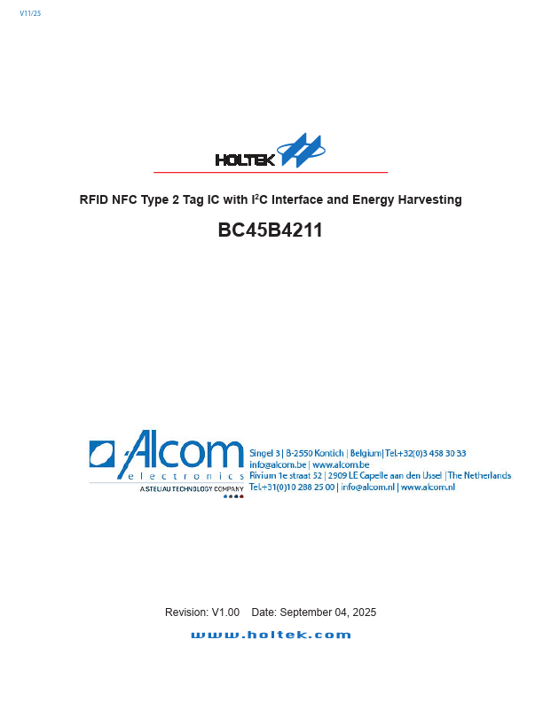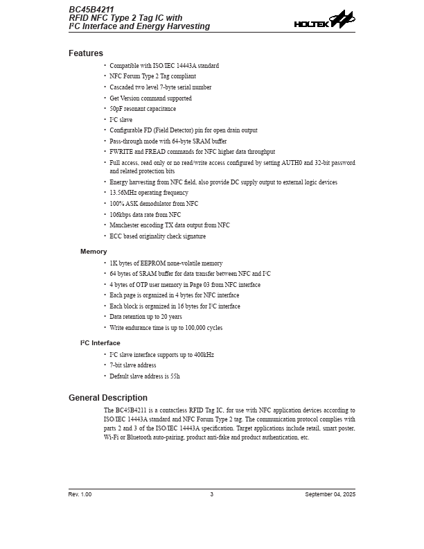 The BC45B4211 is a contactless RFID Tag IC, for use with NFC application devices according to ISO/IEC 14443A standard and NFC Forum Type 2 tag. The munication protocol plies with parts 2 and 3 of the ISO/IEC 14443A specification. Target applications include retail, smart poster, Wi-Fi or Bluetooth auto-pairing, product anti-fake and product authentication, etc.