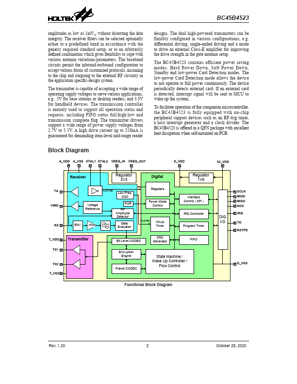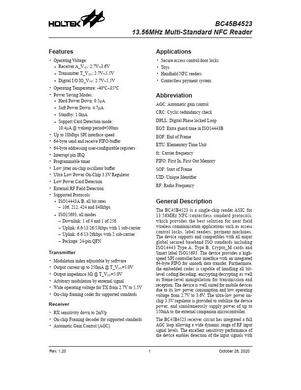 The BC45B4523 is a single-chip reader ASIC for 13.56MHz NFC/contactless standard protocols, which provides the best solution for near field wireless munication applications such as access control locks, label readers, payment machines. The device supports and patibles with all major global secured baseband ISO standards including ISO14443 Type A, Type B, Crypto_M cards and Smart label ISO15693. The device provides a...