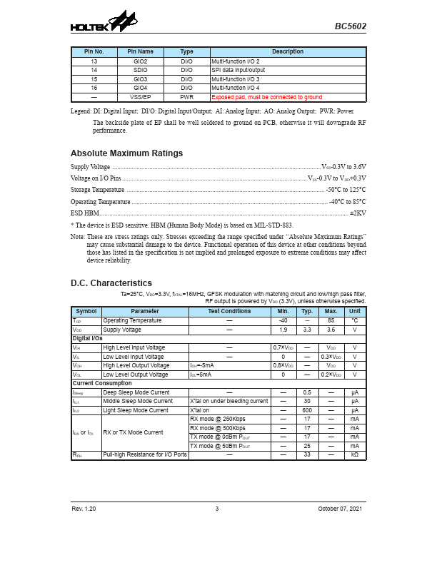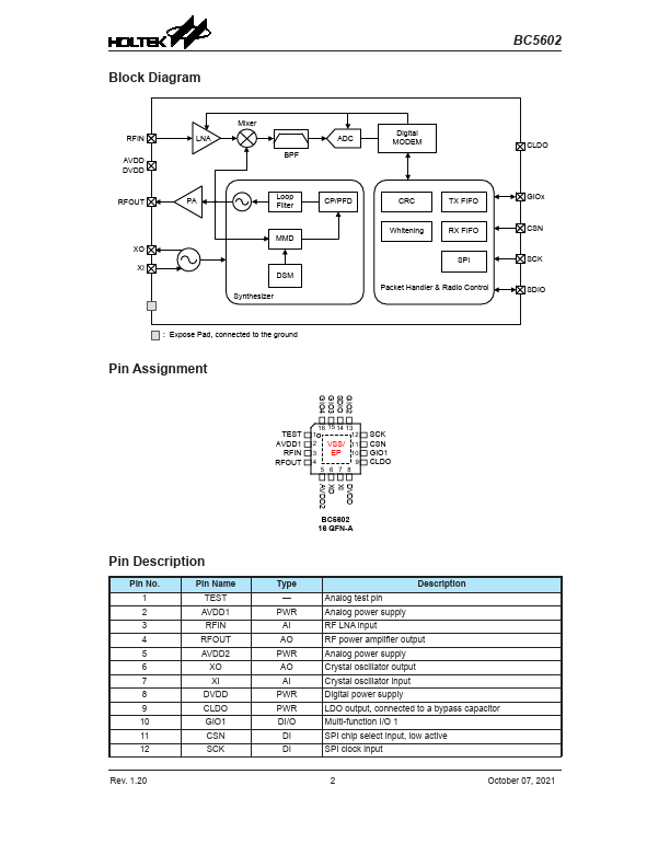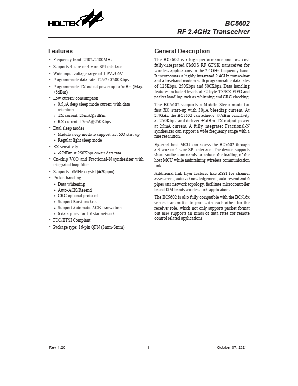 The BC5602 is a high performance and low cost fully-integrated CMOS RF GFSK transceiver for wireless applications in the 2.4GHz frequency band. It incorporates a highly integrated 2.4GHz transceiver and a baseband modem with programmable data rates of 125Kbps, 250Kbps and 500Kbps.