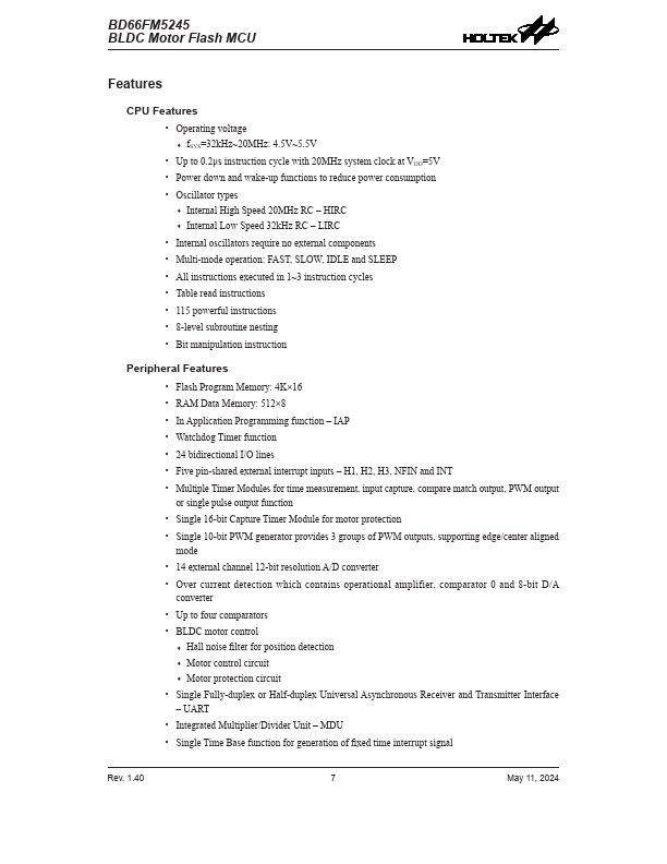 - Up to 0.2μs instruction cycle with 20MHz system clock at VDD=5V