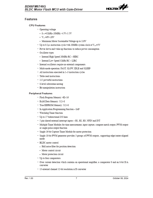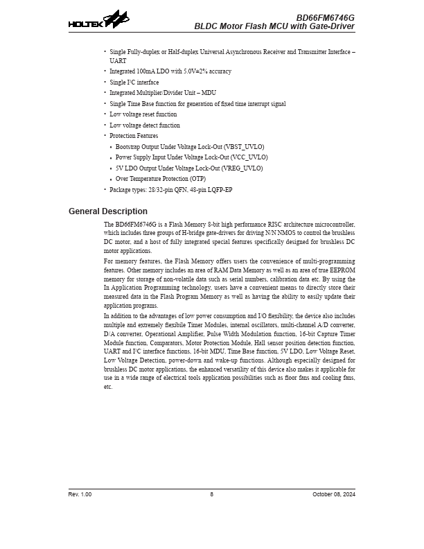 The BD66FM6746G is a Flash Memory 8-bit high performance RISC architecture microcontroller, which includes three groups of H-bridge gate-drivers for driving N/N NMOS to control the brushless DC motor, and a host of fully integrated special.