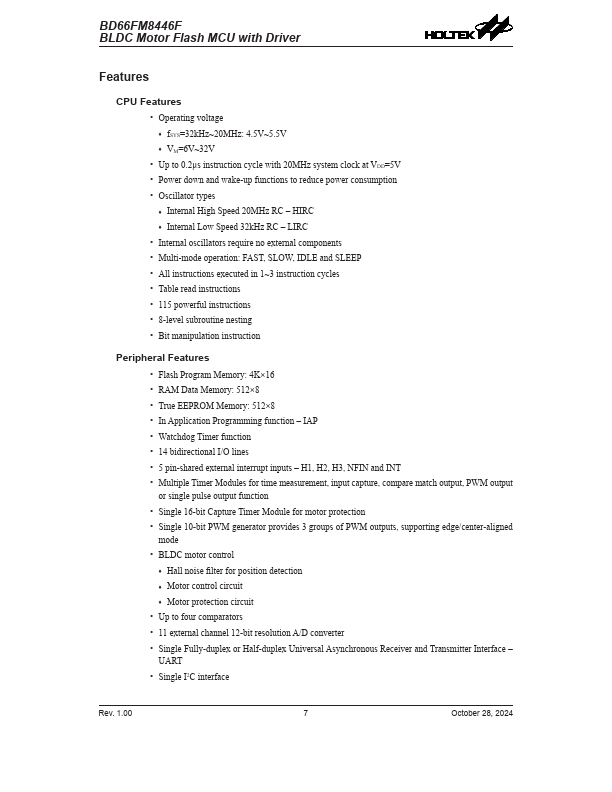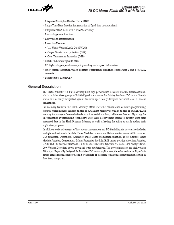 The BD66FM8446F is a Flash Memory 8-bit high performance RISC architecture microcontroller, which includes three groups of half-bridge driver circuits for driving brushless DC motor directly and a host of fully integrated special.