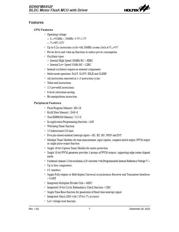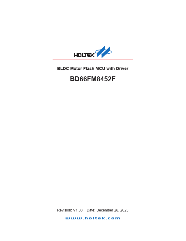 The BD66FM8452F is a Flash Memory 8-bit high performance RISC architecture microcontroller, which includes three groups of half-bridge driver circuits for driving brushless DC motor directly and a host of fully integrated special.
