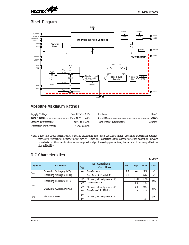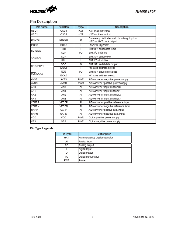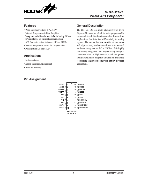 The BH45B1525 is a multi-channel 24-bit Delta Sigma A/D converter which includes programmable gain amplifier (PGA) functions and is designed for applications that interface differentially to analog signals. The device has the benefits of low noise and high accuracy and municates with external hardware using internal I2C or SPI bus. This highly functionally integrated Delta Sigma analog to digital converter with its...